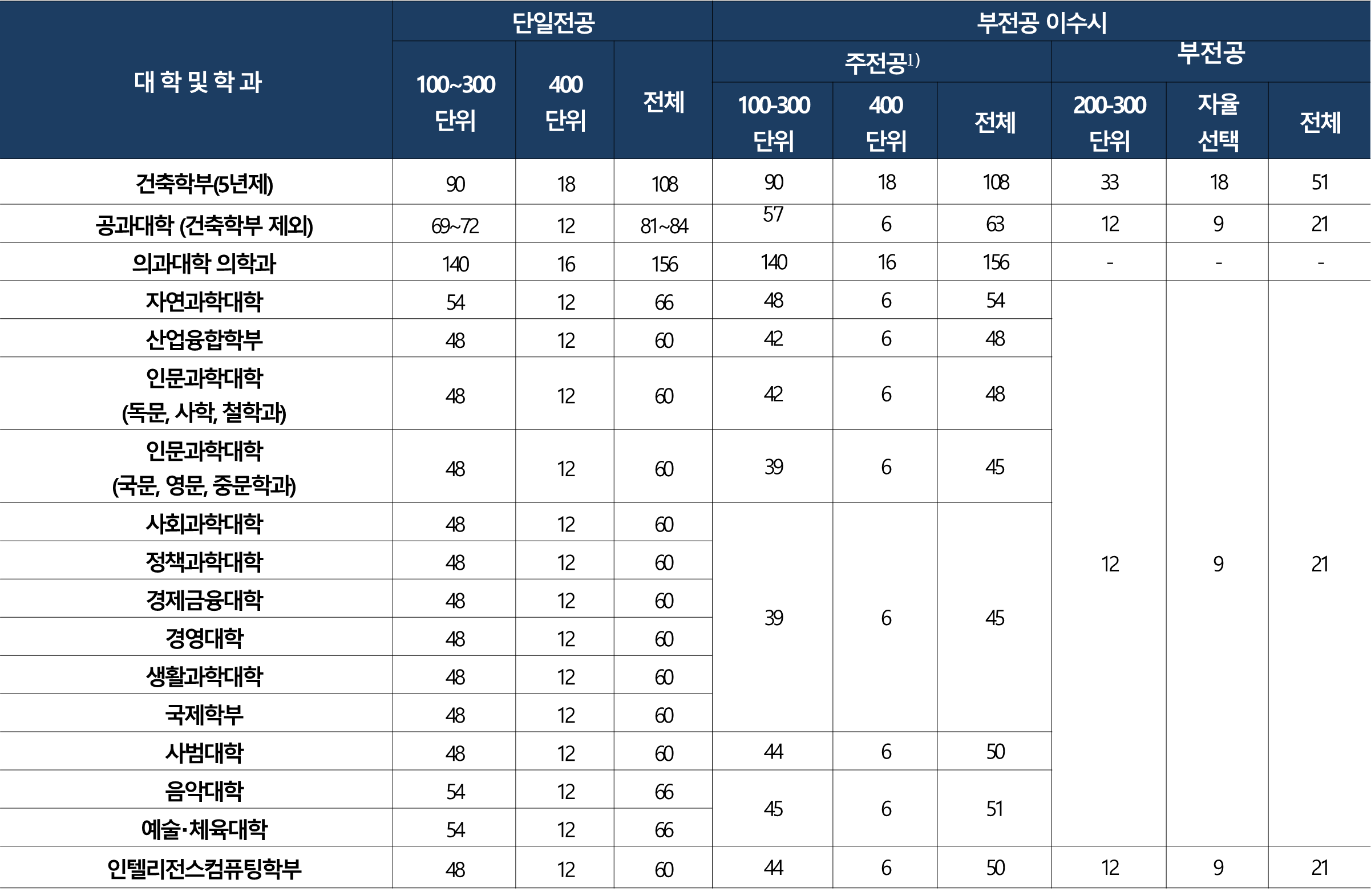 주1): 단일전공만 이수할 때와 부전공을 이수할 때의 주전공 최소 이수학점 기준은 상이함.