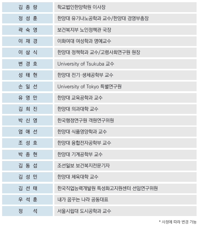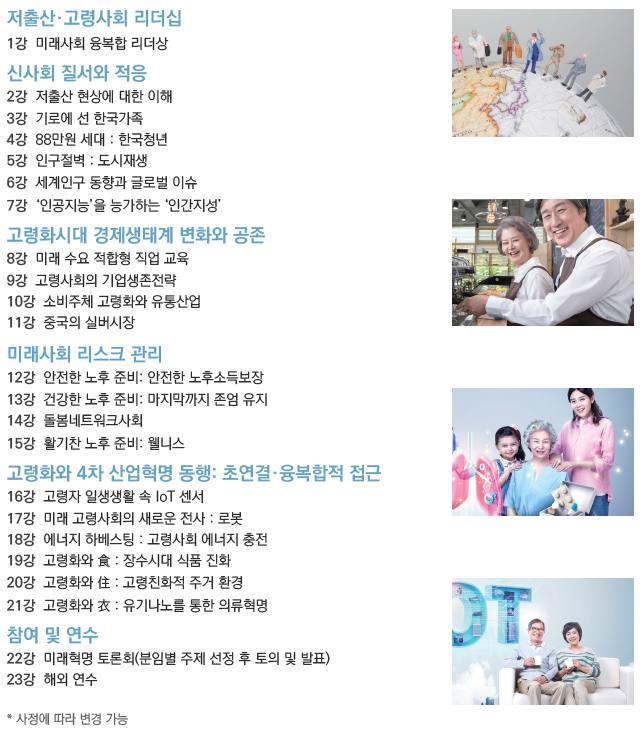 고령화에 따른 환경 변화, 욕구, 환경변화, 기술발전, 노후 설계 준비, 제도개선․정책 등에 대해 교수진(장관, 실무국장, 국책연구원 정책개발자, 국내외 전문가)의 강의 및 토론으로 진행