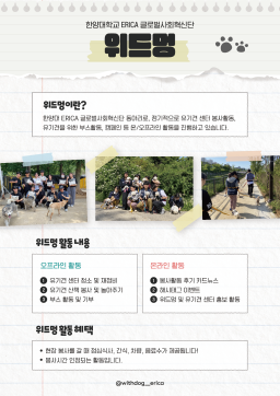 Seventeen Hearts Festival은 한양대학교 글로벌사회혁신단 & 사회봉사단주관으로 한양대학교 건학이념인 "사랑의 실천"을 기반으로 UN SDGs 17가지 목표를 알리며 이를 실천하고 있는 다양한 기업, 단체, 지역 사회와 함께 만들어나가는 축제입니다.